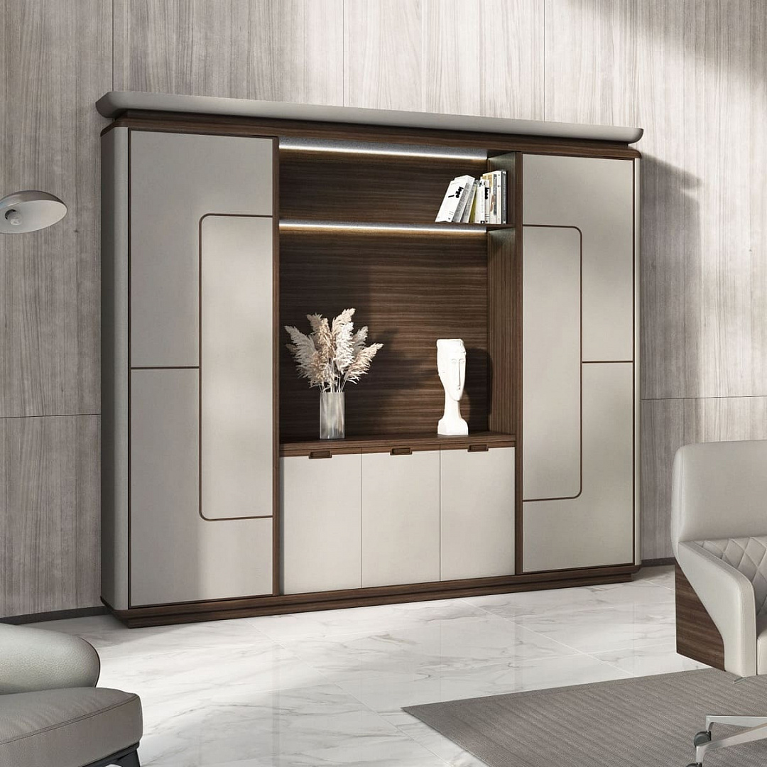 Высокие шкафы коллекции AVATAR внесут в Ваш офис разнообразие и наполнят его гармонией цвета. Особенностью шкафов является обтяжка фасадов кожей с тонкими деревянными инкрустациями. Выбор цветового решения корпусной мебели поддерживается возможностью подобрать цвета мягкой мебели, а также кресла для руководителей и посетителей.